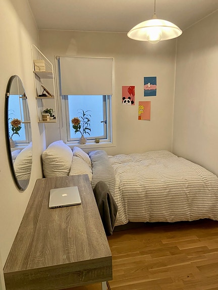 Det er tre soverom i leiligheta og det eine blir ledig frå 01.02.2026. Det er bilde av rommet som blir ledig. Klesskap blir ståande, samt senga på 120cm😊