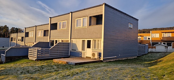 Boligen har et hyggelig inngangsparti med terrasse og stor sydvendt terrasse med utgang fra stue. Boligen ligger i et veletablert borettslag med tomt opparbeidet med gjesteparkering, grøntarealer og asfalterte gangstier. Utsikt over Fannejorden og felles gapahuk i umiddelbar nærhet.