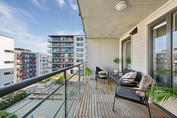 Boligen ligger i fjerde etasje og fremstår svært innbydende med nyoppusset kjøkken, nytt gulv og nymalte vegger fra 2025. Fra stue/kjøkken er det utgang til en stor balkong på ca 12 kvm med ettermiddag- og kveldssol.