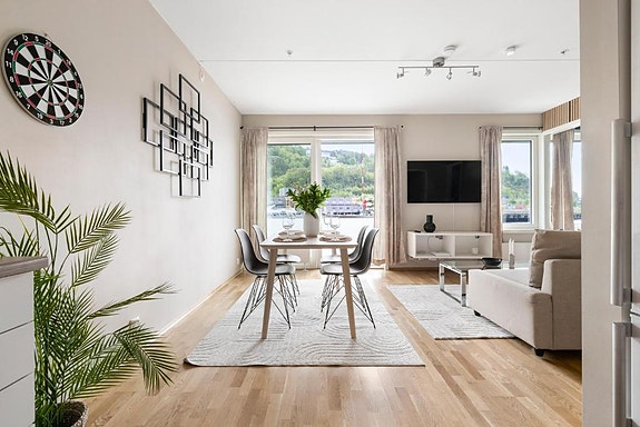 Leiligheten inneholder alt av møbler og inventar, fullt utstyrt kjøkken med hvitevarer, samt arbeidsvennlig spiseplass. Du kan kun ta med personlige eiendeler og sjekke inn umiddelbart. Sengetøy, håndklær og nødvendig utstyr er inkludert i leieperioden.