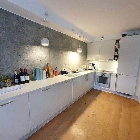 Rommet på 11m2 leies ut møblert slik som på bildene. Jeg kan eventuelt fjerne noen av PC-skjermene dersom du ikke har behov for dem. Det er svært mye skapplass. Leiligheten har to pene, flislagte bad med varmekabler – ett av dem med badekar. Det følger også med en stor terrasse på ca. 10 m², samt tilgang til en felles takterrasse på hele 190 m² med grill og svært gode solforhold om sommeren. Takterrassen brukes nesten bare av oss i bygget. Stue og kjøkken har en åpen og luftig løsning.