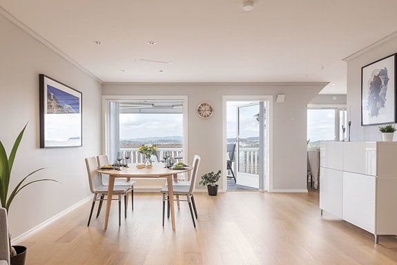 Et innbydende rekkehus med solrik beliggenhet og storslåtte utsiktsforhold. Her bor man i et svært barnevennlig og attraktiv boligområde med kort vei til alt man måtte trenge i en ellers hektisk hverdag.