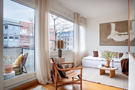 Leiligheten har store vindusflater og over 2,60 meter under taket så den oppleves rom romslig og veldig lys.