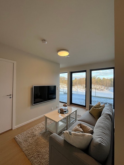 Store vinduer, mye lysinnslipp og høy takhøyde gir svært god romfølelse. Nb: gardiner, skapdører og dimbare lysbrytere skal monteres. Det ekstra lydisolasjon i vegger og tak. Balansert ventilasjon med varmegjenvinning er integrert – som gir jevn friskluft i alle rom og godt inneklima.