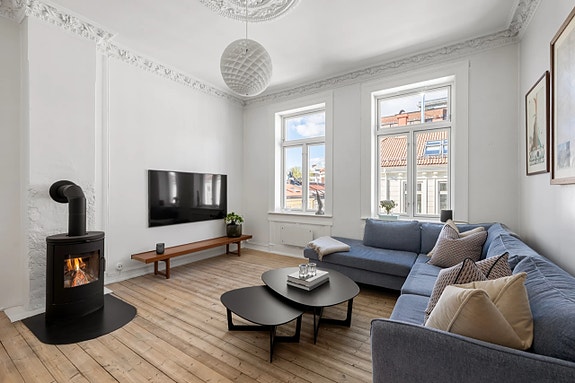 Boligen kan du flytte rett inn i, og preges av et romslig og sosialt kjøkken med unik kjøkkenpeis, en lys og luftig stue med god takhøyde, klassisk stukkatur, rosett, og moderne peisovn, et koselig soverom med spesialbygd garderobe og luftig utsyn til stille bakgård, samt et plasseffektivt bad og toalett. Boligen har en optimal planløsning, og er godt egnet for et sosialt par som liker å invitere på en hyggelig middag eller nyte en kveld foran peisen.