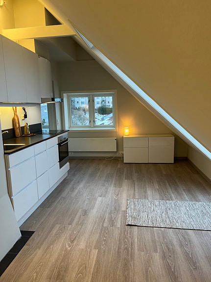 Helt nyoppusset, luftig og koselig sydvendt loftsleilighet med stort takvindu som kan åpnes og slås ut til fransk balkong for herlig 180 graders utsikt på varme sommerdager.