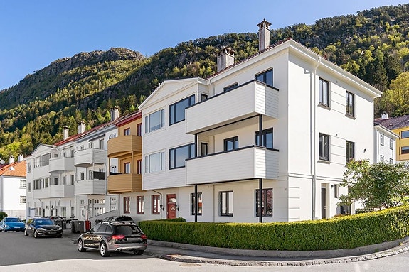 Leiligheten har en fantastisk beliggenhet i Formannsvei, en sjarmerende og særdeles attraktiv gate midt i Sandviken. Området er kjent for sin sentrale men samtidig rolige og tilbaketrukne beliggenhet. Få minutters gange til Bryggen, og ellers alt sentrum har å by på. Kort vei til buss, søndagsåpen nærbutiikk og badeplass. Det følger med en utebod på 5 m2 , hvor man kan plassere sykler/ sparkesykkel og annet. Buss, linje 10, 4 min gangavstand.