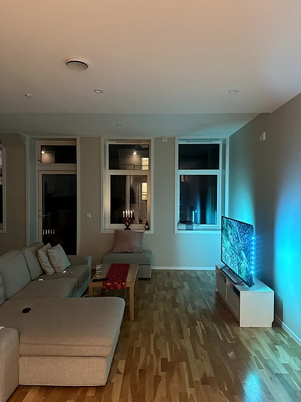 Leiligheten er en 4-roms kollektiv med en stor stue med åpen kjøkkenløsning og et stort baderom. Det befinner seg også en stor veranda som brukes mye ila sommeren. Leiligheten inneholder elektrisk gulvvarme og er i utgangspunktet umøblert, men leiligheten er fult møblert.