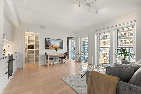 Leiligheten ble ferdigstilt i 2019 og holder en gjennomgående høy standard med flotte parkettgulv. Leiligheten har en god planløsning. Lekkert kjøkken med hvite fronter, delikat flislagt baderom med stilren innredning, walk-in-garderobe med garderobeplass og et soverom.