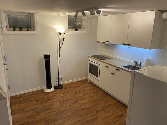 Åpen stue-kjøkkenløsning med nytt og moderne kjøkken. Kjøkkenet er innredet med integrert platetopp og komfyr. Her er frittstående kjøleskap med en liten hylle til frysevarer. Det er opplegg for oppvaskmaskin.