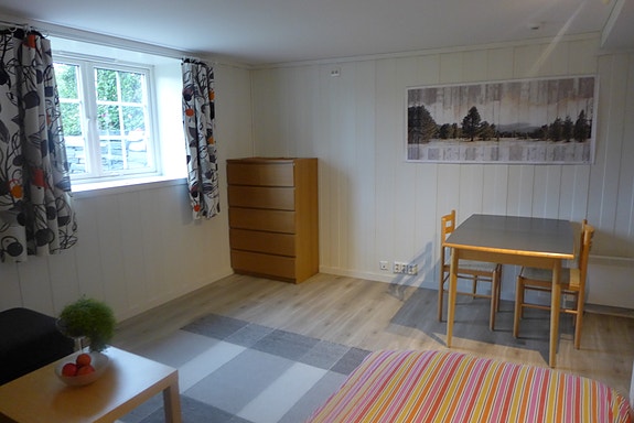 Romslig stue med plass til spisebord, sofa og seng.