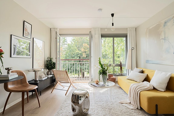 Stuen er romslig og har fransk balkong og store vindusflater som gir rikelig med naturlig lys. Åpen kjøkken/stueløsning gir en åpen og hyggelig følelse.