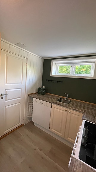 • Kjøkken utstyrt med kjøleskap, komfyr og oppvaskmaskin