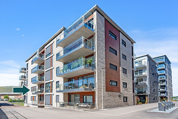 Balkongen er 8,5 m2 og ligger sydvendt. Det er utsikt mot brygga og den nye bystranda er like utenfor døren. Det er sykkelparkering i garasje.