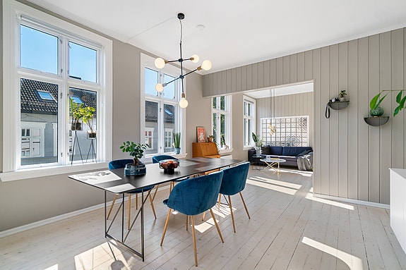 Leiligheten har en todelt og lekker stue med store vindusflater som fyller hjemmet med naturlig lys. Her er det også god høyde til himling som gjør det ekstra luftig. Gulvet er av tre. Rommet har en stilren peisovn. God plass til større spisemøbler hvor du kan dekke på til familie og venner.