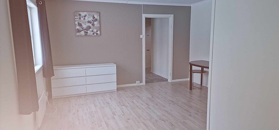 i Leiligheten finner du en sovealkove, stue i en del og kjøkken i et annet rom, bad med dusj.