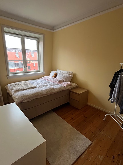 Rommet som leies ut er fint og romslig, det er plass til stor seng, kommode/skap og pult. Det er en koselig stue, kjøkken med oppvaskmaskin og bad med vaskemaskin og tørketrommel.