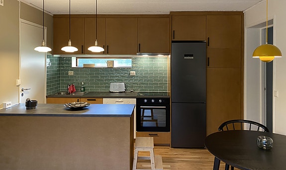 Kjøkkenet har god skap- og benkeplass, og kjøkkenøy med skuffer. Det medfølger hvitevarer: