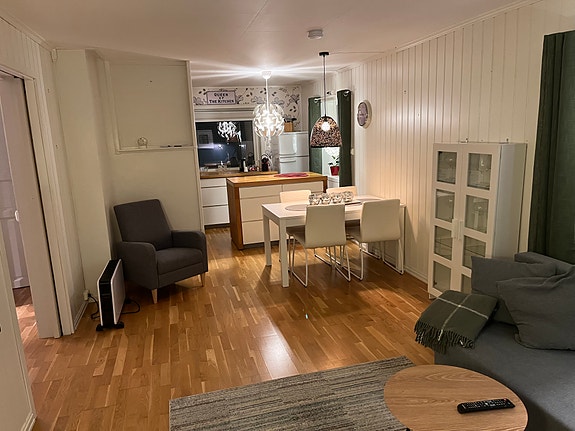 Inkluderer vaskemaskin, kjøleskap med liten frys, stekeovn, koketopp og oppvaskmaskin. Seng 140x200 med oppbevaring under. På bildet er en sovesofa i stua, stol, spisebord, stoler og TV med chromecast som også kan følges med. Dette avtales.