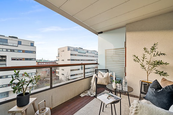 Nydelig balkong på 6 m2 med fint utsyn og sol store deler av dagen.