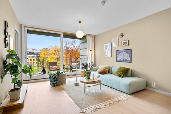 Boligen har en luftig og åpen planløsning med store vindusflater som gir rikelig med naturlig lys, samt utgang til en hyggelig sydøst-vendt balkong som fungerer som en forlengelse av stuen store deler av året.