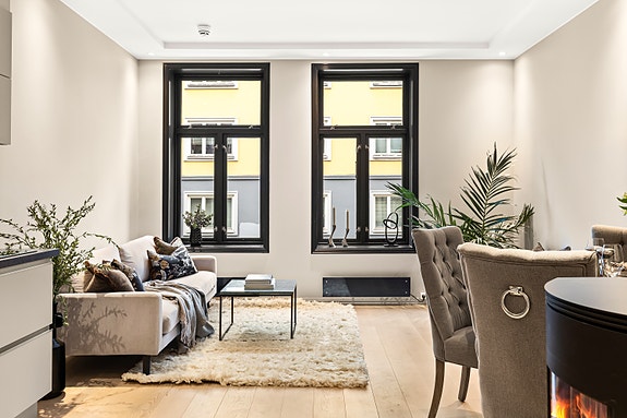 Svært tiltalende og sjarmerende leilighet i flott klassisk bygård, beliggende i rolig gate med gangavstand til det meste! Tilbaketrukket i høy 1.etasje, med umiddelbar tilgang til hyggelig bakgård og stor bod i kjeller.