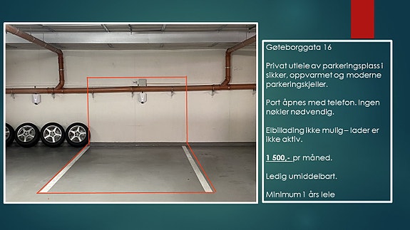Parkeringsplassen er i et moderne oppvarmet garasjeanlegg i Gøteborggata 16.