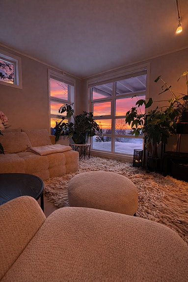 • Åpen og moderne stue med vedfyring og varmekabler i gulv.