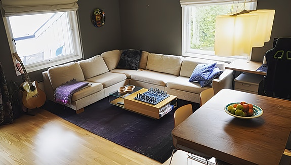 Stuen er romslig og innbydende, med god plass til både sofagruppe, spisebord og hjemmekontor. Her er det store vindusflater som slipper inn rikelig med dagslys. Leiligheten er møblert med blant annet: