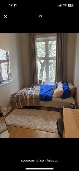 Rommet som leies ut er på ca. 10 kvm med god høyde under taket og stort flott vindu som slipper inn masse lys. Vi ligger i andre etg. og har derfor ingen innsyn fra gaten.