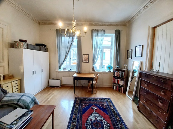 Rommene har klassiske detaljer som stukkatur og rosetter i taket, samt store vinduer som slipper inn masse dagslys ☀️. God takhøyde gjør at rommene føles enda større. Det følger også med skap til begge rommene, frittstående skap på 19m² og innebygd skap på to meter på rommet på 15m². I tillegg har leiligheten tre boder, så her er det virkelig god plass til alt du måtte trenge – og litt til.