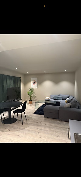 Felles stue, kjøkken og bad. Leiligheten er fullt møblert i fellesarealer.