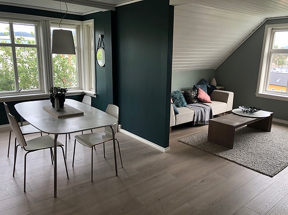 Stor stue med spisestue, flott nytt kjøkken og delikat bad, 1 soverom og et gjesterom/kontor/barnerom.