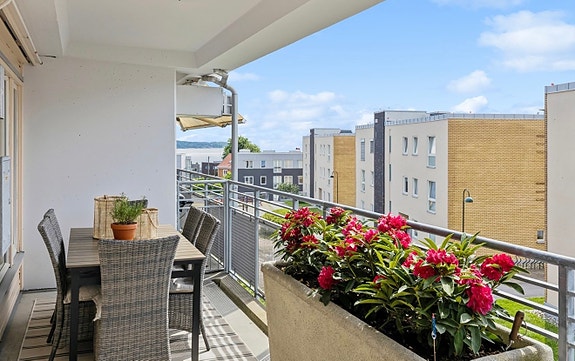 Balkongen har nydelig utsikt. Leiligheten har flislagt bad/ vaskerom og ett soverom m/garderobeløsning. Seksjonen disponerer en egen bod i fellesarealene, og det medfølger egen parkeringsplass i felles garasjekjeller.