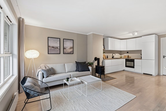Leiligheten er romslig og har en praktisk planløsning. Store vindusflater og lyse farger på veggene . Det er tre soverom med gode oppbevarings muligheter, samt "walk in closet" tilknyttet et av soverommene. Leiligheten er nyrenovert i 2026 med nytt kjøkken og hvitevarer. På badet har man både vaskemaskin og tørketrommel fra Miele. Balkong med overbygg med meget gode solforhold med utsikt over friområde.