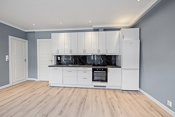 Stue med et åpen kjøkkenløsning med nyere integrerte hvitevarer, 2 soverom av god størrelse og et meget pent flislagt bad med varmekabler. God takhøyde i alle rom, samt store klassiske vinduer og brede detaljerte listverk gir en herskapelig følelse til leiligheten. Nylig oppusset til moderne standard, samtidig som det har blitt lagt stor vekt på lydisolerende og strømsparende tiltak som etterisolering av alle vegger, tak, gulv, nye energi-sparende vinduer og dimbare LED spotter i alle rom.