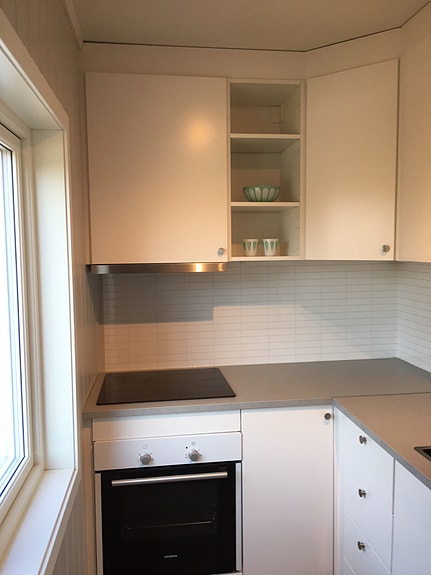 Hvitevarer som kjøleskap, komfyr, steketopp og vaskemaskin er på plass i hybelen.