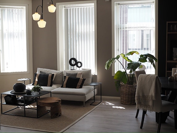 (Skinnstol, trestubbe og svarte små sidebord ved sofa følger ikke med)