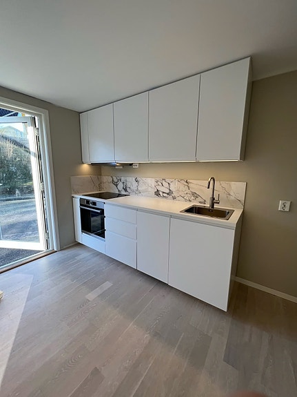 Lys og fin hybel nærme sjøen, på ca 33 kvm. Hybelen har et stort bad og kjøkken fra IKEA. Kjøkkenet har marmorfliser samt hvitevarer fra 2022. Integrert oppvaskmaskin og frittstående kjøleskap. Godt med skapplass. Det er åpen kjøkkenløsning med plass til sofa, tv og bord.