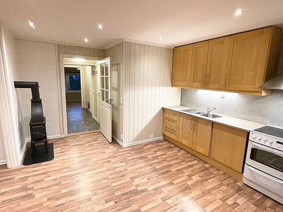 Leiligheten har kombiskap kjøl/frys, oppvaskmaskin, komfyr og kombinert vaskemaskin/tørketrommel.