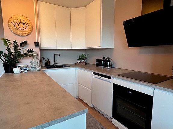 Integrerte hvitevarer: oppvaskmaskin, komfyr, steketopp.