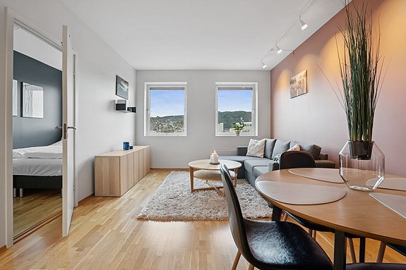 Som beboer får du tilgang til felles takterrasse med panoramautsikt, perfekt for å nyte sol og utsikt over byen og fjorden.