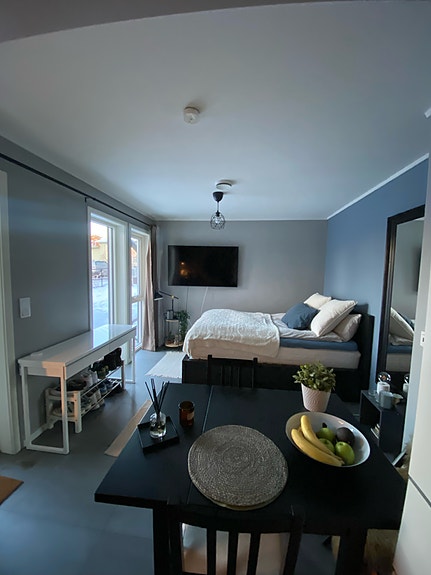Hybelen er delvis møblert og inkluderer romslig garderobeskap samt hvitevarer som oppvaskmaskin og vaskemaskin. Det moderne kjøkkenet fra 2019 har integrert induksjonsplatetopp og stekeovn, og gir gode løsninger for matlaging i hverdagen.