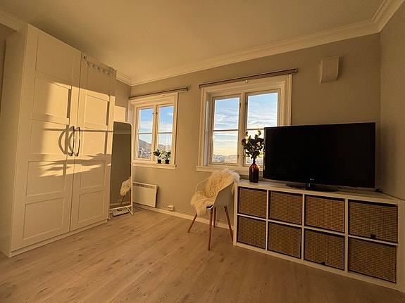 Rommet er i andre etasje med fin utsikt og inkluderer seng og stort garderobeskap.