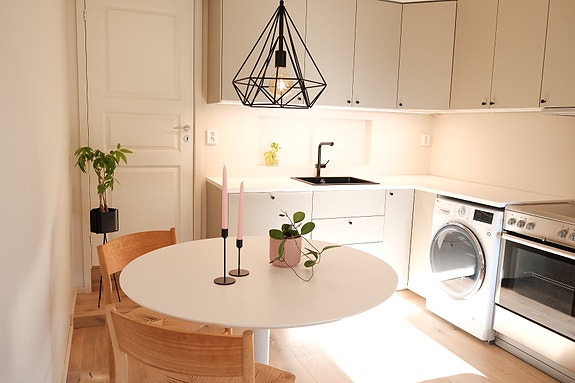 Kjøkken med vaskemaskin med tørketrommelfunksjon, kaffemaskin, oppvaskmaskin med mer.