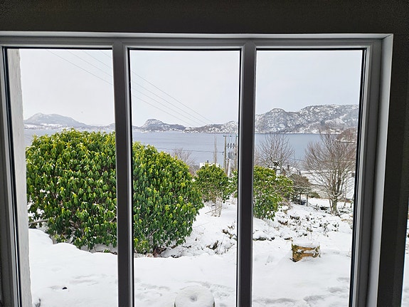 Eiendommen byr på en stor, skjermet hage som er spesielt vakker om våren med sine store rhododendronbusker, plomme- og morelltrær og en bekk som slynger seg gjennom tomten. Fra stuen og fra uteområdet er det storslagen utsikt over fjorden.