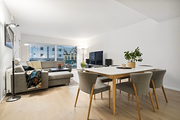 Sørvendt balkong gir gode solforhold, og store vindusflater gir rikelig med naturlig lys.