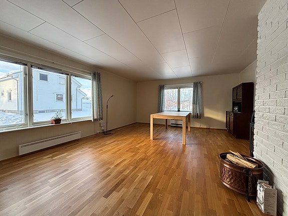 Stor stue, to soverom, må gjennom det største soverommet for å komme inn på badet, ikke så stort kjøkken. Malte plater på vegger på mange rom. Parkett på stue og gang. Ikke gulvvarme på badet. Varmepumpe (ny) og vedovn på stua. Garasje. Mulighet for lagerplass i garasje/bu.