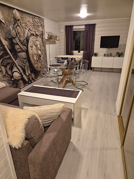 Leiligheten består av stue/kjøkken med spiseplass, TV-benke med TV, glass spisebord + 4 stoler, stor uttrekkbar hjørnesofa og stor garderobeskap med speildører. Kjøkkenet har kjøkkenskap, kjøleskap, komfyr og varmekabler i gulvet.