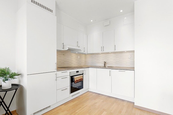 Åpen kjøkkenløsning mot stuen. Kjøkkenet har en tidløs og moderne innredning med integrerte hvitevarer. Godt med skap og benkplass. Gulv: Parkett. Vegg: Malt.